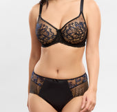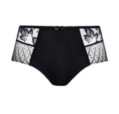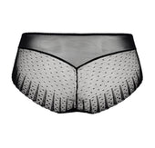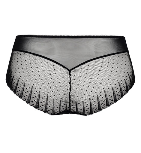 Shorty briefs Striking design visually lengthens the leg Embroidered front lined with tulle for added comfort. Fine mesh back without elasticated thigh, invisible under clothing Flat trims Waist decorated with a square gold charm Spanish embroidery French lace Black: Deep and luminous, it sculpts the figure with natural elegance. Luna’s shorty briefs are all about lines, cut-outs and transparency. The embroidered waves that run up the thigh elongate the silhouette, creating a fee...