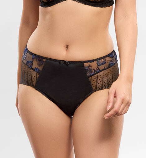 High-waisted full briefs Front and back in soft, opaque mesh Striking lace on the sides to give the silhouette a daintier look Discreet finish thanks to turned-back elastic Waist featuring decorative elastic Square gold charm matching the rest of the line Spanish embroidery French lace Black: Chic depth that highlights the precision of the pattern. The Luna briefs offer reassuring coverage combined with a modern look. Their opaque, soft and comfortable mesh fabric is enhanced wit...