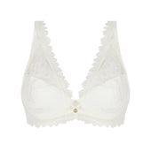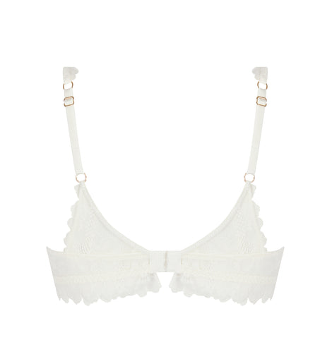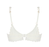 The upper cup is crafted from embroidered organza lace trim, while the lower cup features embroidered organza lace. The frame and back inset are made of jacquard lace trim. The front strap is a delicate split spaghetti strap adorned with an organza bow. The center front features a sheer invisible tulle cutout over lace, embellished with a gold-tone rhinestone jewel. Rings and adjusters are finished in gold-tone metal.