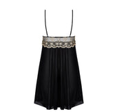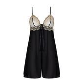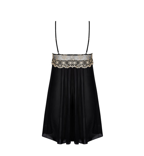Babydoll in silk satin with a laminated embroidered panel at the neckline and fine silk straps. The back features a laminated embroidered motif connected to the hem by fine silk ties.