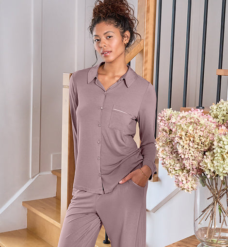 A cozy classic - upgraded. Our signature cloud-soft fabric, functional features, and a relaxed fit made for real lounging. Bonus: those elevated satin details. Features: - Functional button-down top - Functional satin drawstrings - High quality satin charmeuse details - Pockets - 2-piece set - TENCEL™ Modal - Micro fibers - Ethically made Washing instructions: - Hand wash, cold water OR machine wash closed in mesh bag, gentle cycle - Hang to dry