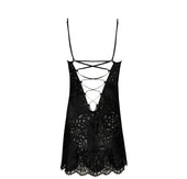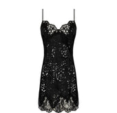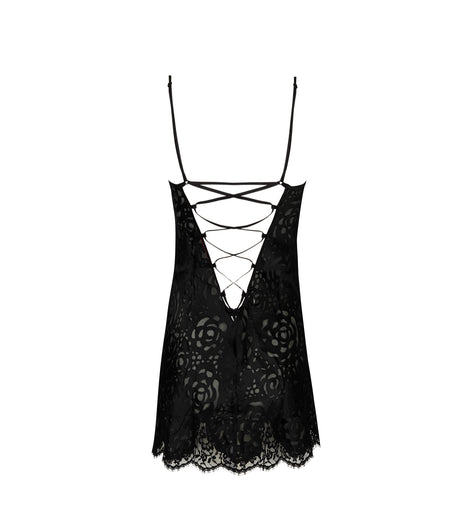Babydoll with under-the-cheeks length. Fine silk satin straps. Back opening with lacing for added femininity and seduction. Calais lace trim at cleavage and at the base.