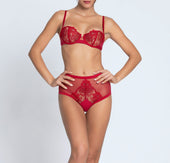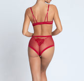 High-waisted sexy shorty structured at the waist and thighs with mesh bands. The front features multifilament embroidery with an organza flower appliqué in a pointed shape, and the sides are seamless tulle. The lower front, in a pointed shape, is made of tulle lined with cotton. The back in elastic tulle forms a triangle embellished with a coordinated embroidered motif on the front, topped with a golden chain. A side ribbon loop at the bottom allows for the addition of a thigh jewel.