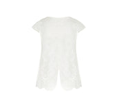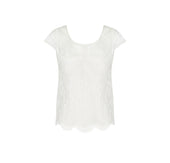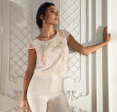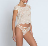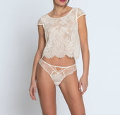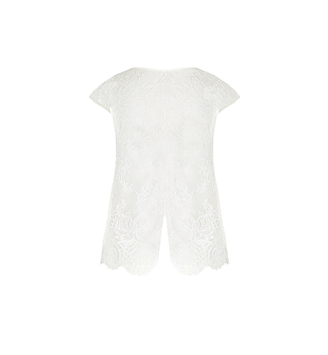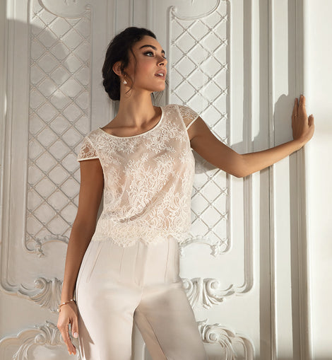 Short lace top, lined with tulle at the front, split halfway at the bottom of the back. Scoop neckline, short sleeves, and the model is scalloped at the bottom. Interior finish with a silk binding.