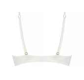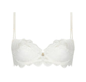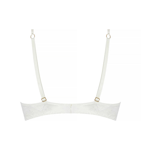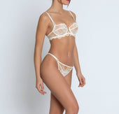 Top cup with scalloped embroidery and multi-thread guipure, bottom cup in coordinated lace. Scalloped embroidered bra-band enhanced in the center with a cut-out in tulle and embroidery, highlighted with a gold rhinestone jewel. The back center is enriched with a lace cut-out. The front straps are accentuated with a gold rhinestone jewel.