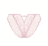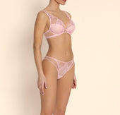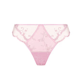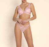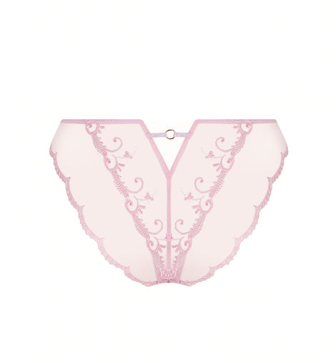 Brief with scalloped embroidery on the thighs, embellished with a slender cut-out in multi-thread embroidery on the front and back sides and a coordinated embroidered laize in the middle front. The upper back is embellished with an invisible tulle triangle, crowned by a beaded ring held in place by an elastic satin ribbon.