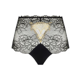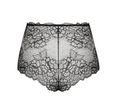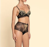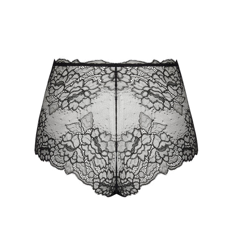 Entirely crafted in wide scalloped Calais Leavers lace trim, top and bottom. Laminated embroidered motif at the front center. Tulle triangle at the back.